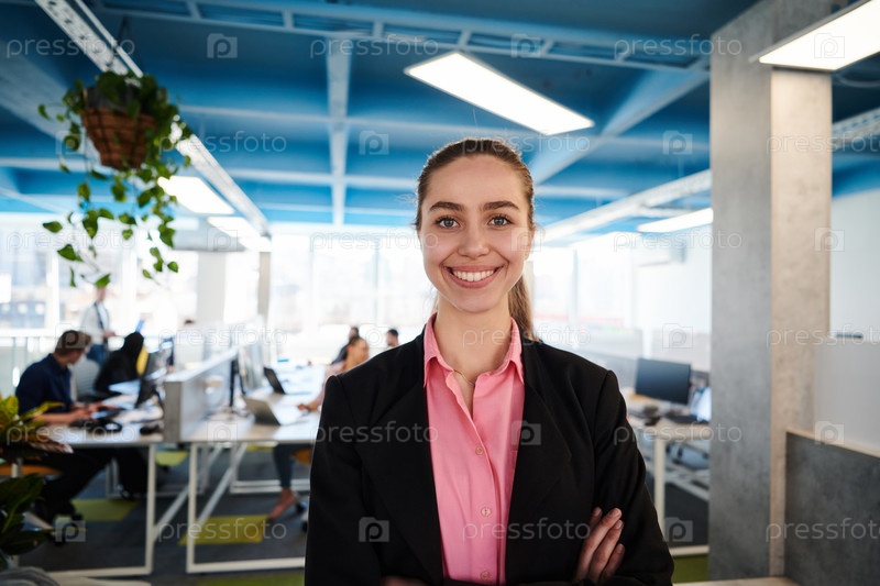 Портрет молодой улыбающейся деловой женщины в творческом коворкинг-стартапе на открытом пространстве. Успешная деловая женщина, стоящая в офисе с копировальным пространством. Коллеги работают в фоновом режиме