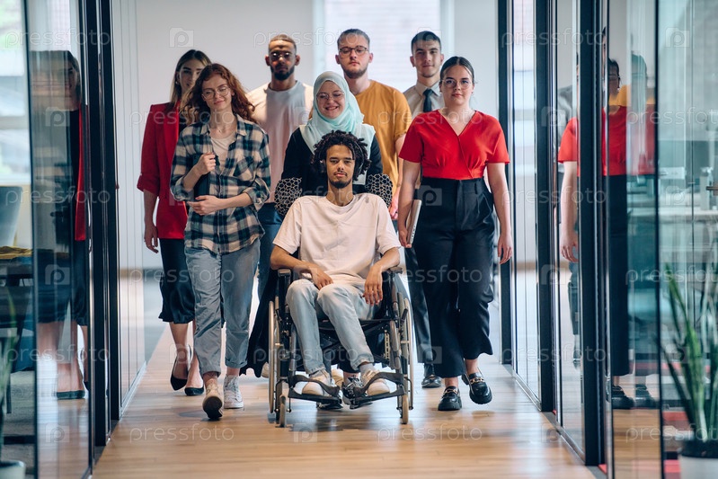 Разнообразная группа молодых бизнесменов собирается в застекленном офисе современного стартапа, в котором участвуют человек в инвалидной коляске, молодой афроамериканец и мусульманка в хиджабе