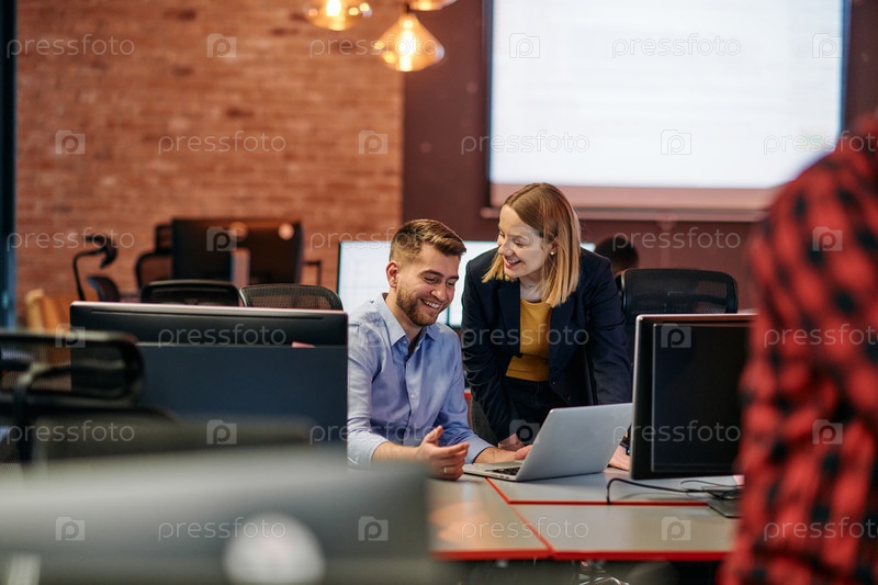 Коллеги по бизнесу, мужчина и женщина, обсуждают бизнес-стратегии, внимательно глядя на монитор компьютера, олицетворяя сотрудничество и инновации