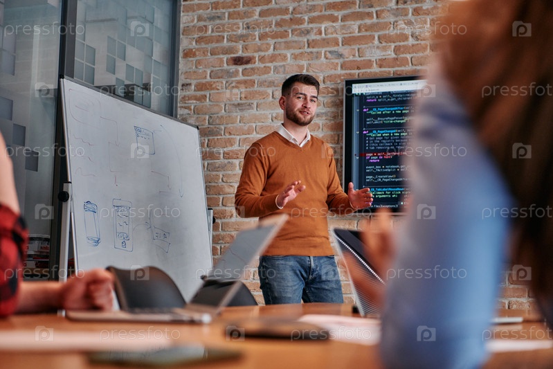В корпоративной обстановке бизнесмен проводит встречу, страстно представляя бизнес-план своей внимательной команде, способствуя сотрудничеству и стратегическому мышлению