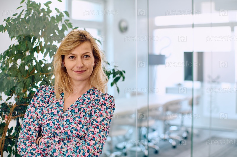 Сияющая деловая женщина: яркое присутствие в коридоре компании