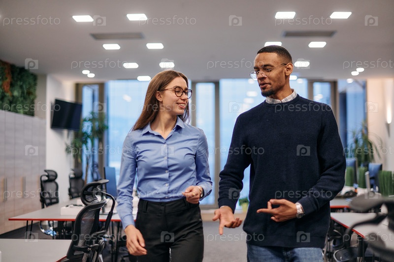 Динамичное деловое сотрудничество: блондинка-бизнесмен и афроамериканская коллега в современном офисе