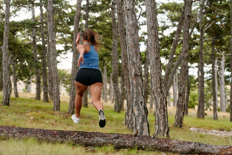 Бесстрашная женщина преодолевает деревянные препятствия в опасной лесной местности