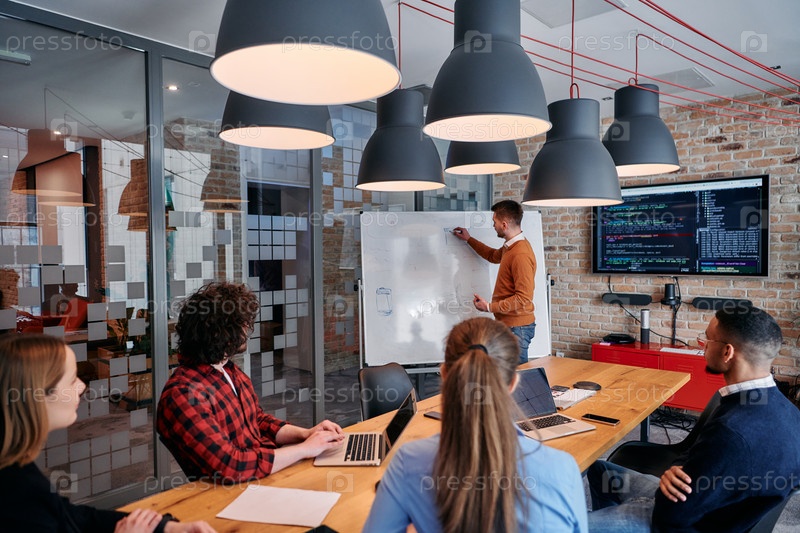 В корпоративной обстановке бизнесмен проводит встречу, страстно представляя бизнес-план своей внимательной команде, способствуя сотрудничеству и стратегическому мышлению