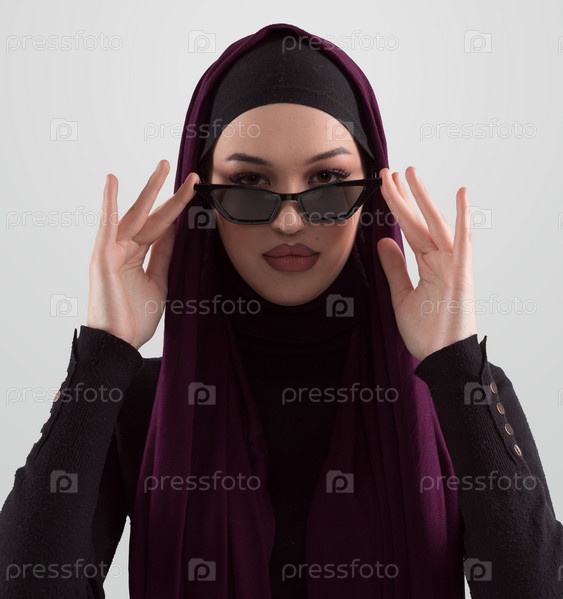 Портрет красивой стильной молодой мусульманки в черном хиджабе и солнцезащитных очках как концепция современной восточной моды, позирующей на белом фоне