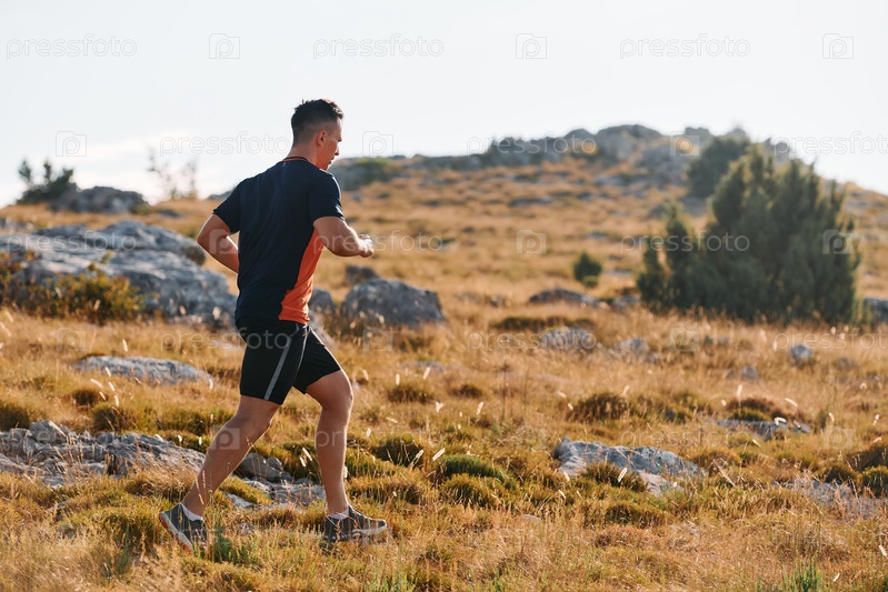 Решительный спортсмен бежит по пересеченной горной местности на рассвете