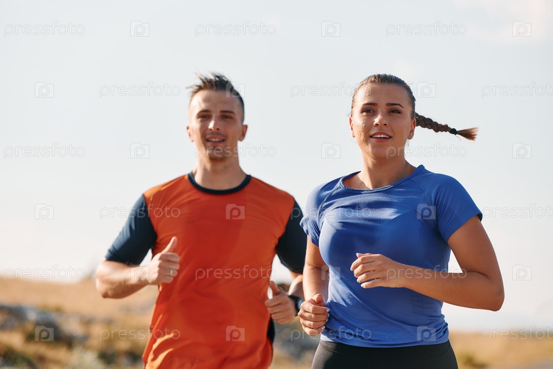 Пара в спортивной одежде бежит по живописной дороге во время утренней тренировки, наслаждаясь свежим воздухом и поддерживая здоровый образ жизни