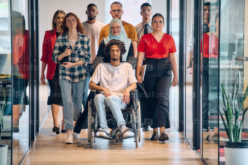 Разнообразная группа молодых бизнесменов собирается в застекленном офисе современного стартапа, в котором участвуют человек в инвалидной коляске, молодой афроамериканец и мусульманка в хиджабе