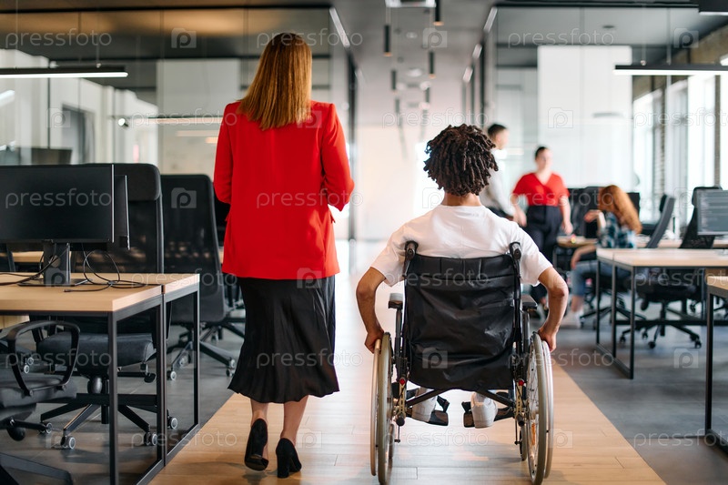 Бизнес-лидер со своим коллегой, афроамериканским бизнесменом-инвалидом, проходят мимо своих коллег, работающих в современных офисах
