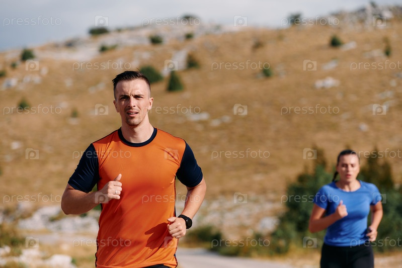 Пара в спортивной одежде бежит по живописной дороге во время утренней тренировки, наслаждаясь свежим воздухом и поддерживая здоровый образ жизни