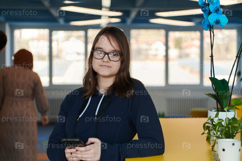Портрет счастливой многоэтнической деловой женщины, использующей смартфон в агентстве. Успешная деловая женщина в повседневной одежде, работающая в коворкинге творческого офиса под открытым небом