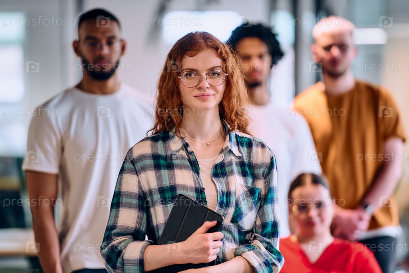 Разнообразная группа молодых бизнесменов, идущих по коридору в застекленном офисе современного стартапа, включая человека в инвалидной коляске и женщину в хиджабе