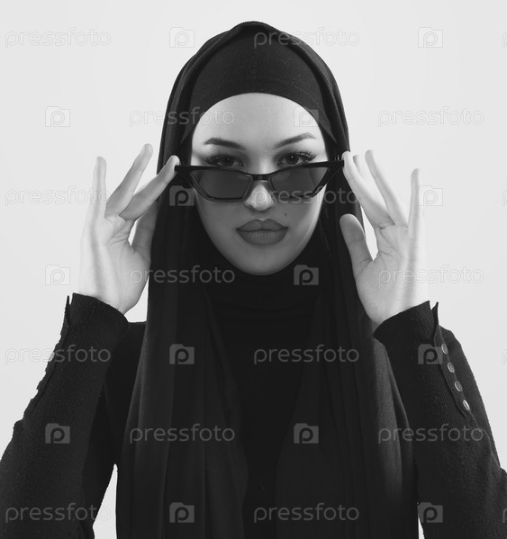 Портрет красивой стильной молодой мусульманки в черном хиджабе и солнцезащитных очках как концепция современной восточной моды, позирующей на белом фоне