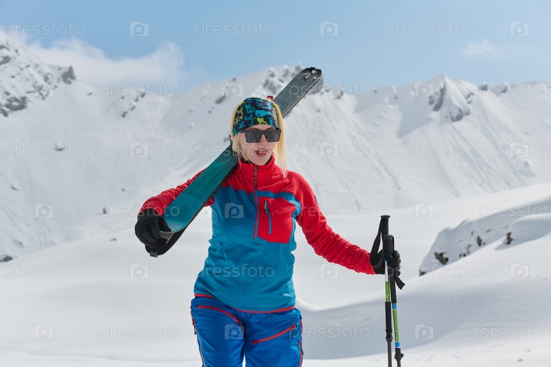 Профессиональная лыжница радуется успешному восхождению на заснеженные вершины Альп