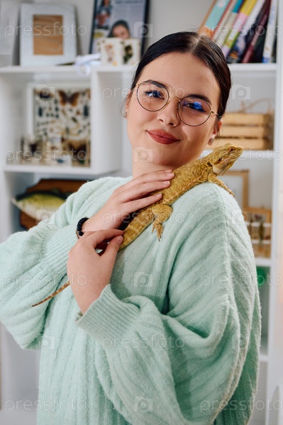 Красивая женщина позирует со своими очаровательными бородатыми драконами