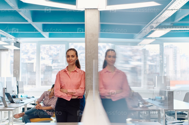 Портрет молодой улыбающейся деловой женщины в творческом коворкинг-стартапе на открытом пространстве. Успешная деловая женщина, стоящая в офисе с копировальным пространством. Коллеги работают в фоновом режиме