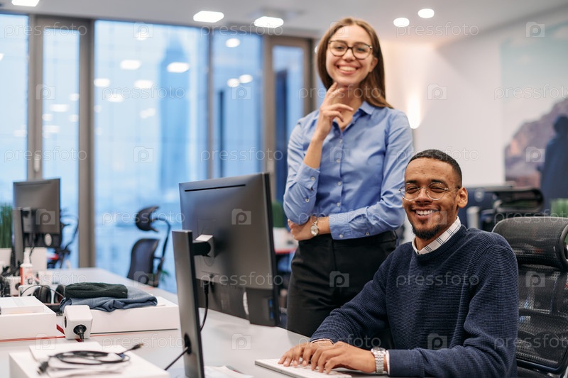 Цифровое сотрудничество: блондинка-бизнесмен и афроамериканский партнер просматривают документы в Интернете