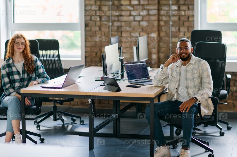 Группа коллег, женщина с яркими оранжевыми волосами и молодой афроамериканский бизнесмен, сидящие в современном офисном помещении, символизируют разнообразное сотрудничество и динамичную рабочую среду