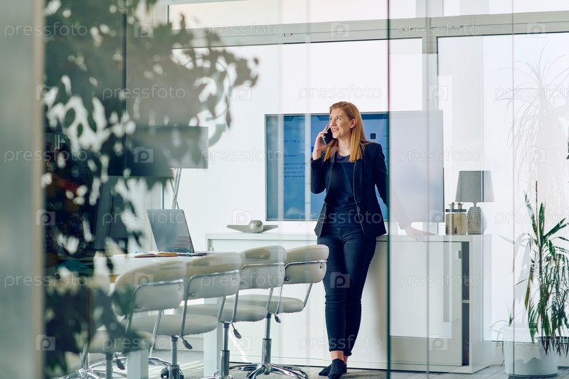 Деловая женщина разговаривает по смартфону в современном офисе