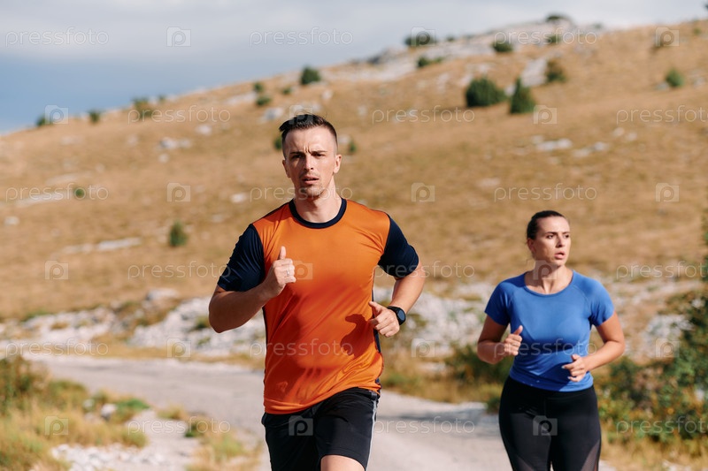 Пара, одетая в спортивную одежду, бежит по живописной дороге во время утренней тренировки, наслаждаясь свежим воздухом и поддерживая здоровый образ жизни