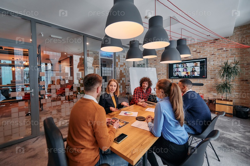 В оживленной атмосфере современного стартап-офиса разнообразная команда бизнес-профессионалов обсуждает различные проекты и разрабатывает новые бизнес-стратегии, олицетворяя креативность и инновации в предпринимательской сфере