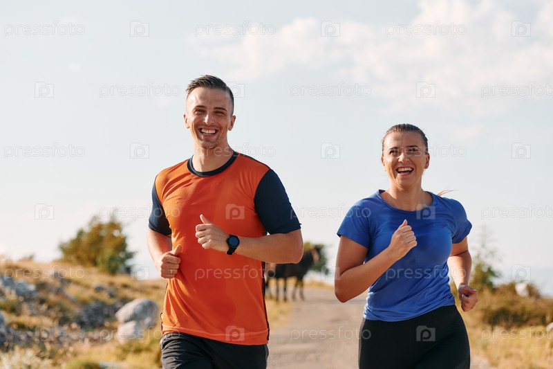 Пара в спортивной одежде бежит по живописной дороге во время утренней тренировки, наслаждаясь свежим воздухом и поддерживая здоровый образ жизни