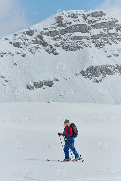 Женщина-альпинистка поднимается в Альпы со снаряжением для бэккантри