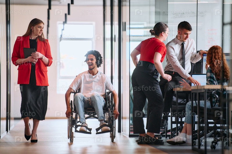Бизнес-лидер со своим коллегой, афроамериканским бизнесменом-инвалидом, проходят мимо своих коллег, работающих в современных офисах