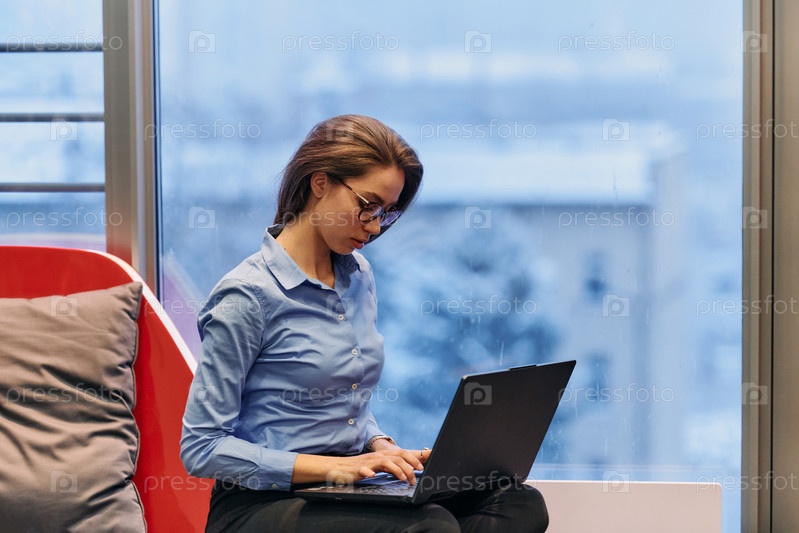 Деловая женщина использует свой ноутбук, сидя у окна большого корпоративного здания, на фоне которого открывается живописный вид на городской пейзаж