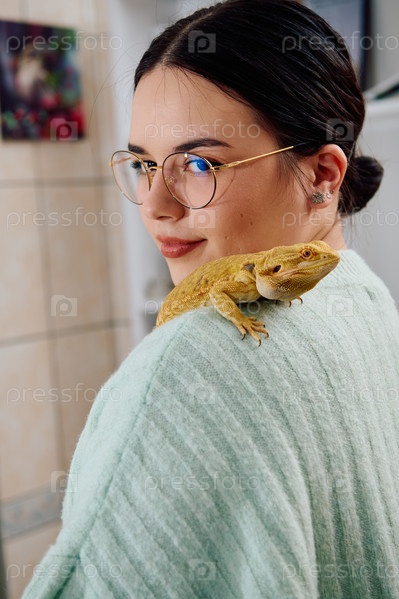 Красивая женщина позирует со своими очаровательными бородатыми драконами