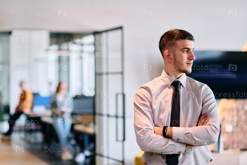 Молодой бизнес-лидер стоит со скрещенными руками в коридоре современного офиса, излучая уверенность и целеустремленность, олицетворяя динамичное и вдохновляющее присутствие