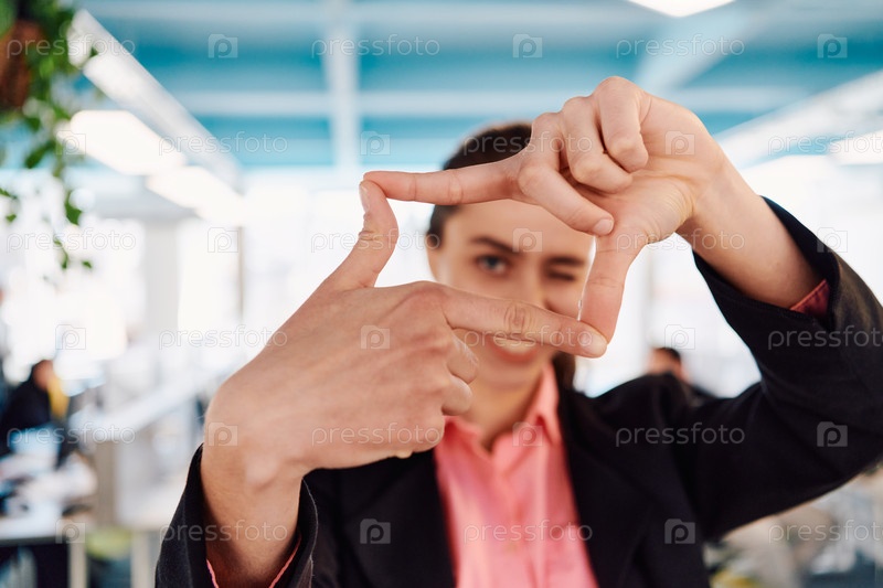 Крупный план рук, улыбающаяся деловая женщина, делающая рамочный жест в современном ярком коворкинге открытого офиса стартапа