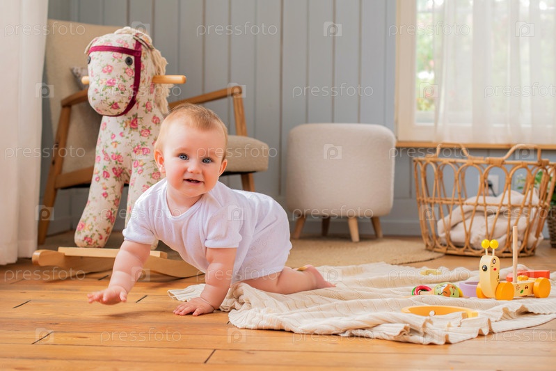 Младенец ползает по полу перед лошадкой-качалкой. Ребенок улыбается и наслаждается моментом