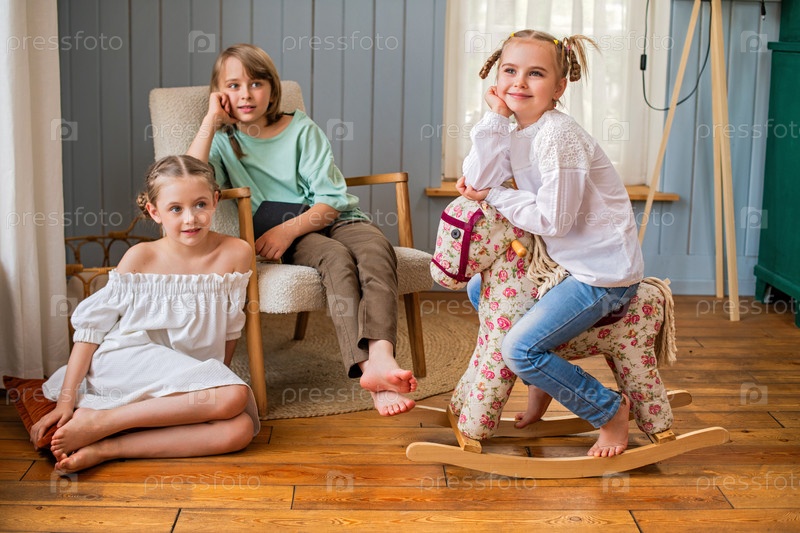 Счастливые дети играют и общаются вместе в интерьере детской комнаты в загородном доме