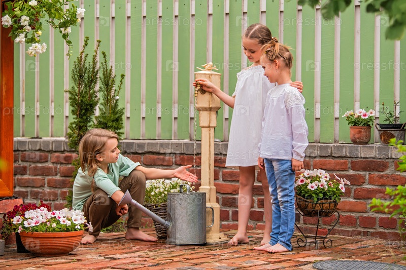 Детское садоводство. Дети помогают на заднем дворе, вместе ухаживают за растениями и цветами