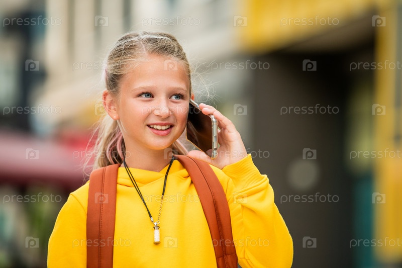 Школьница с рюкзаком идет по городской улице и разговаривает по телефону