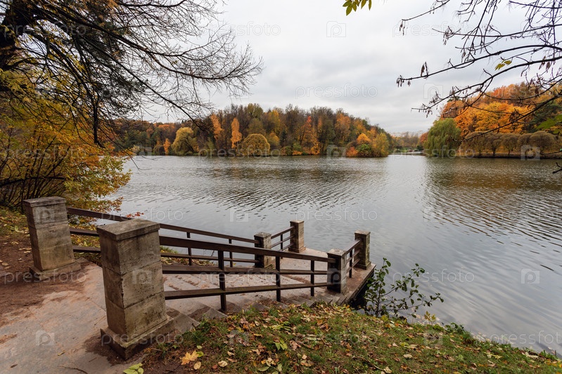 Осенний пейзаж с озером в парке. Россия, Москва