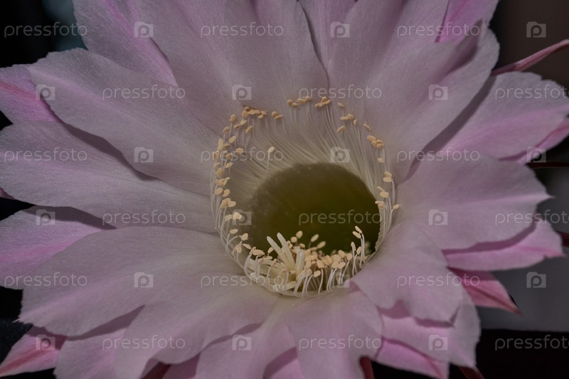 Макрофотография цветка кактуса Эхинопсис (лат. Echinopsis) в полном цвете.Вблизи от цветка видны его нежные розовые листья и белоснежные клещи