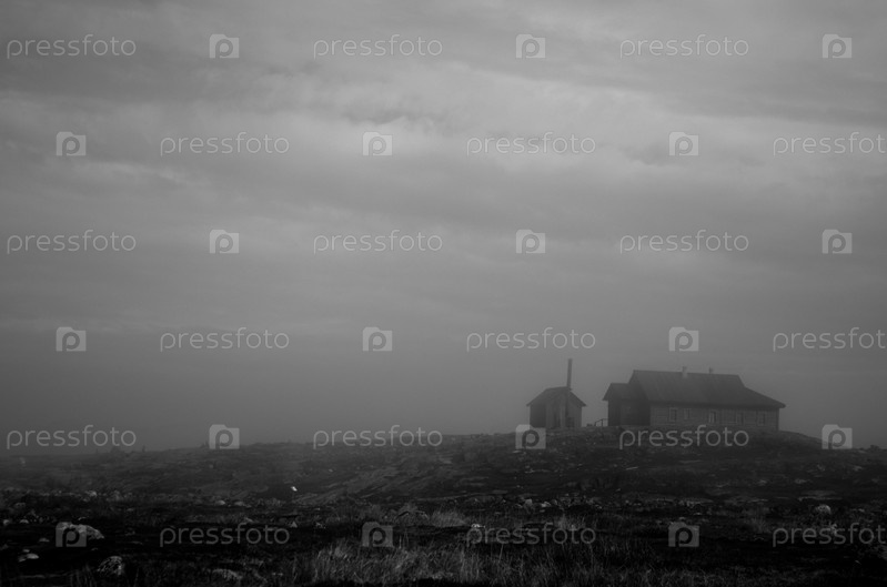 Старый одинокий деревянный дом на вершине холма в тундре, на крайнем севере России, черно-белая фотография