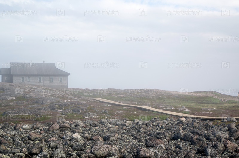 Старый одинокий деревянный дом на вершине холма в туманной тундре с деревянной тропой, далеко на севере России