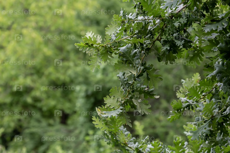 В лесу растет растение (Quercus) с зелеными листьями