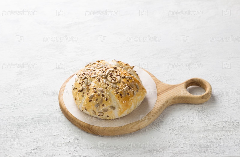 Запеченный в сыре из слоеного теста, посыпанный семенами на деревянной доске на сером текстурированном фоне