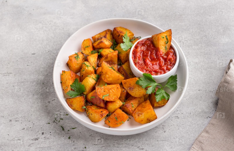 Традиционный испанский картофель, пататас бравас с копченой паприкой, острым томатным соусом и петрушкой в белой миске на фоне серого камня, вид сверху. Вкусная домашняя еда