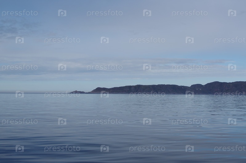Тихая гладь северного моря с островом на горизонте в центре на фоне вечернего голубого неба с облаками