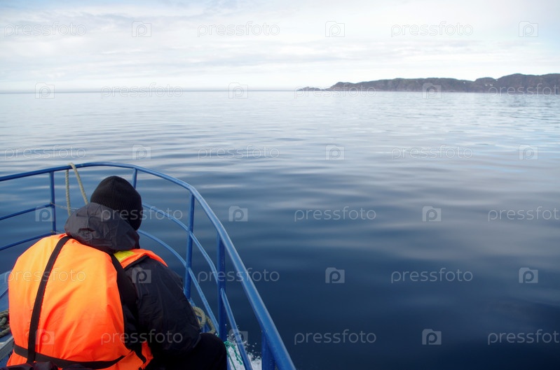 Один мужчина в ярком спасательном жилете сидит на носу лодки среди спокойных вод северного моря