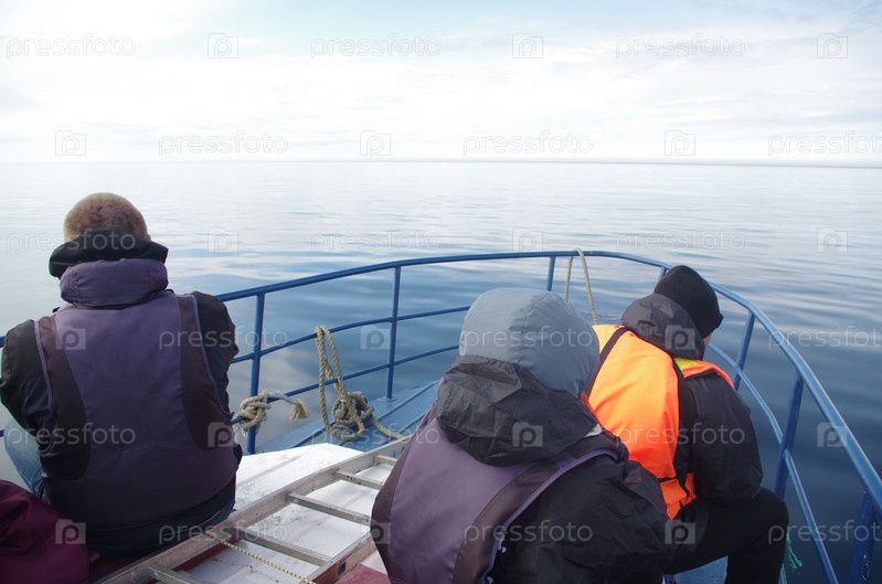 Три человека в спасательных жилетах сидят на носу лодки среди спокойных вод северного моря