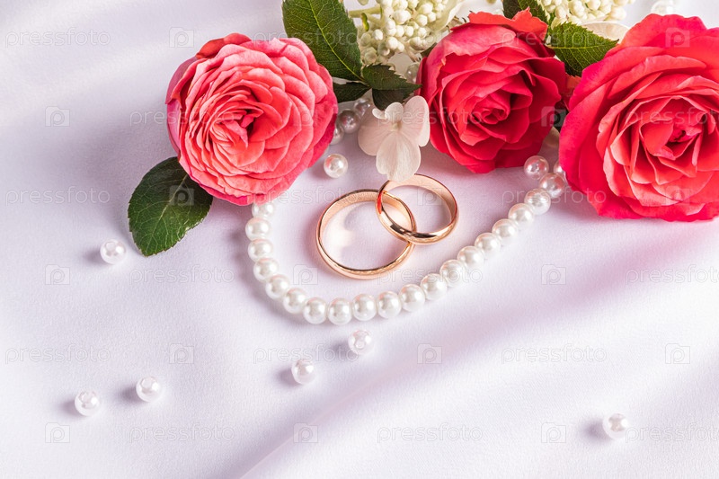 Два золотых обручальных кольца на белом атласе среди жемчужных бус и розовых роз. открытка, обложка, шаблон приглашения. Концепция свадьбы