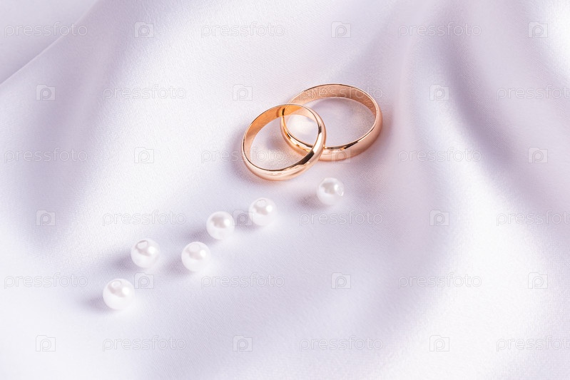 Пара золотых обручальных колец на белом атласном фоне с россыпью нескольких жемчужин. открытка. приглашение. Копировальное пространство. минимализм