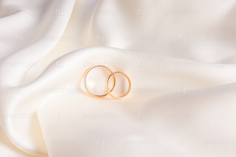 Два золотых элегантных обручальных кольца лежат на мягких складках атласной ткани бежевого цвета. стильный свадебный фон. открытка. приглашение. Презентация продукта