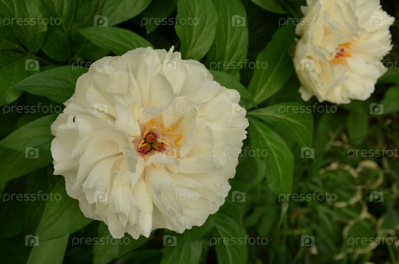 Большой белый цветок пеонии с небольшим букетом на листочке